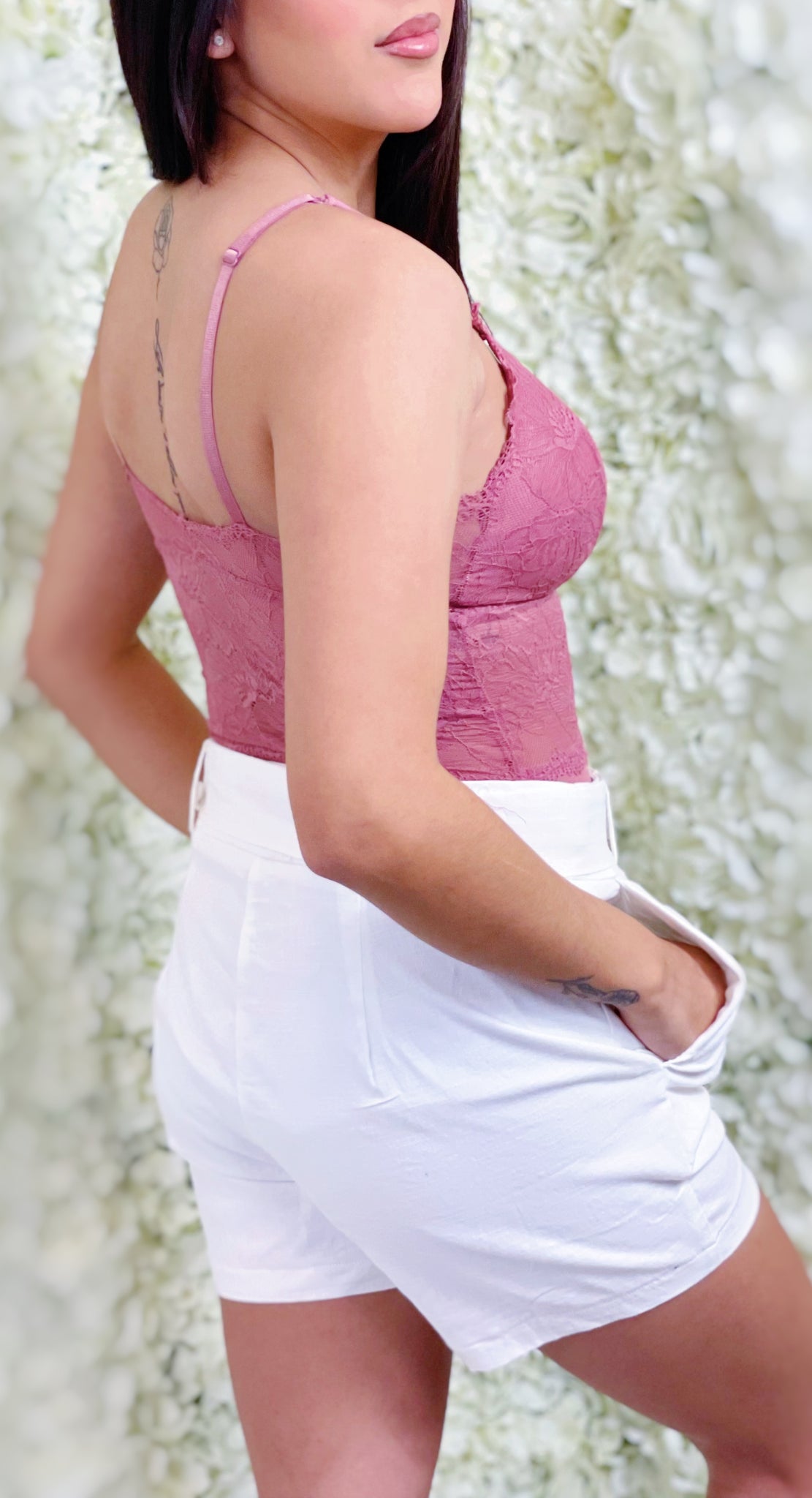 Our rose pink lace bodysuit features small corset straps in the v-neckline and a sheer bodice. It pairs perfectly with cute shorts, pants, or skirts.