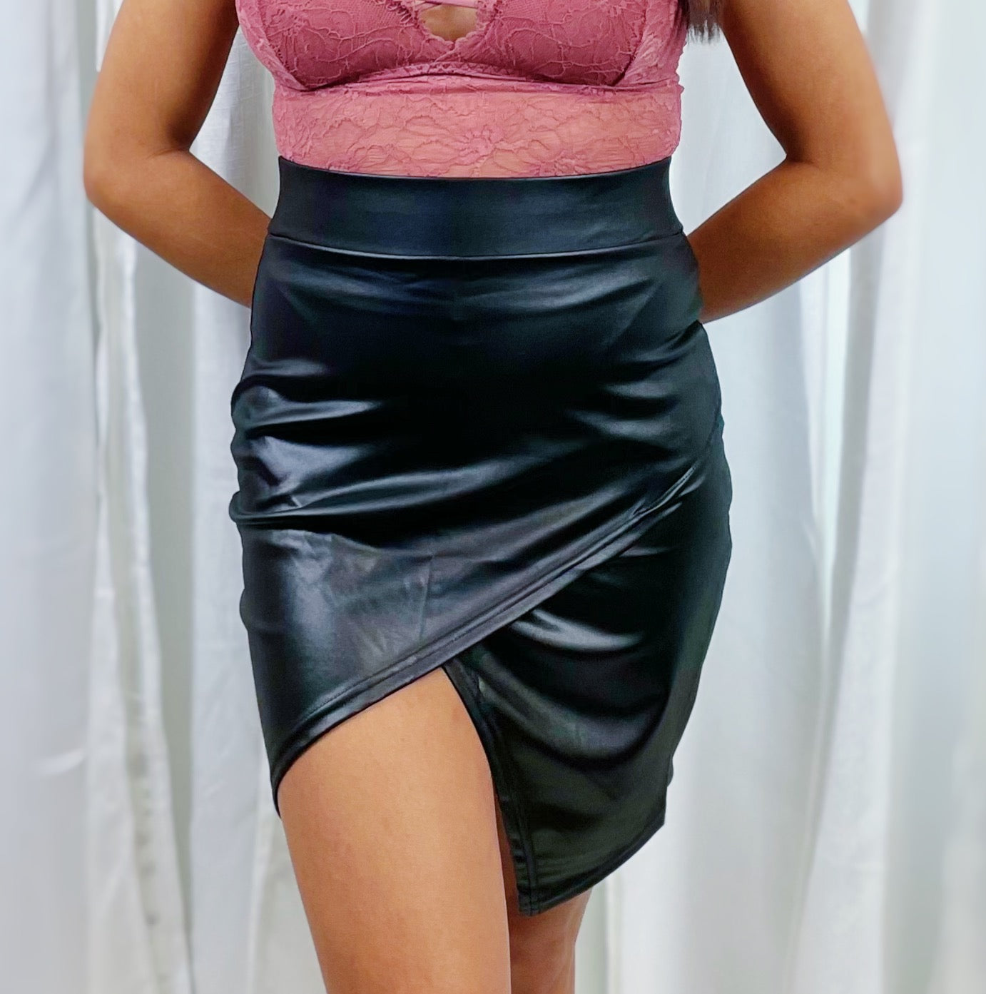 Get ready for a great night out with this black faux leather skirt. It features an angled slit and a nice thick waist band. This skirt is the perfect combination of style and sophistication. Perfect for a night out, the black faux leather material and angled slit will make you look and feel amazing all night long. You'll appreciate the added comfort of the 1.5-inch waistband. Steal the show with this stunning skirt!