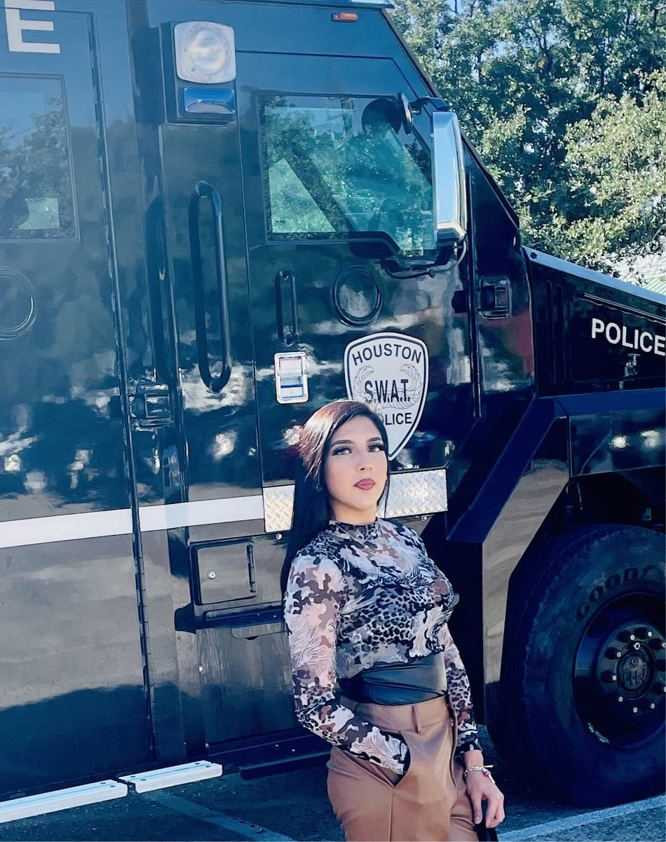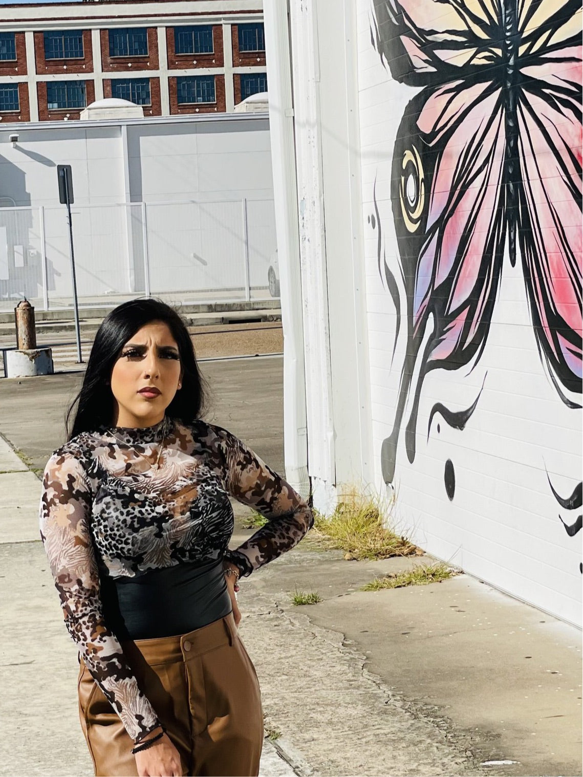 mesh out long sleeve cute top with multiple stamp out design,complement black or brown faux leader pants or skirt.