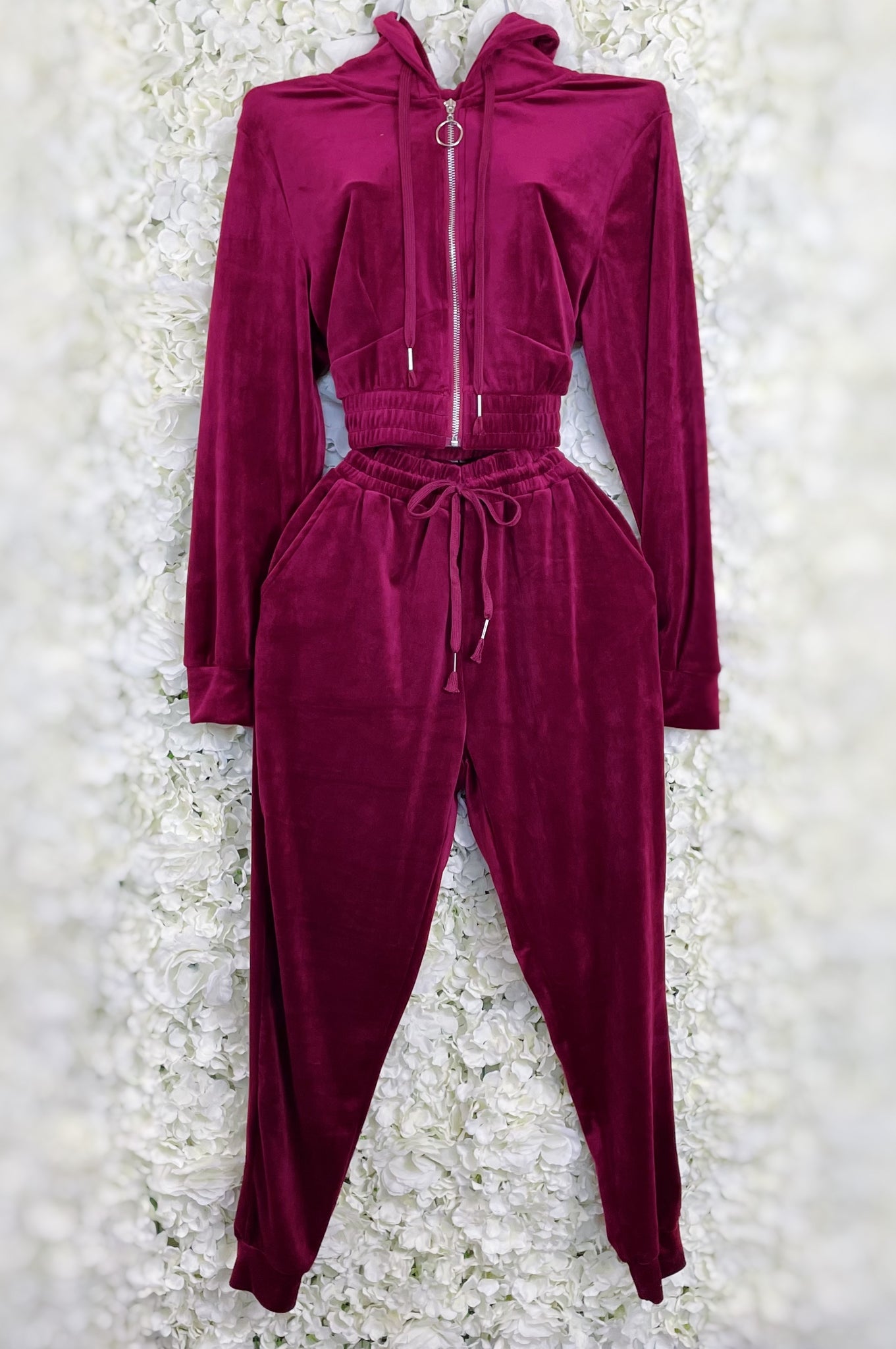 This cozy two piece set features a velvet crop top hoodie with a zip-up jacket and laces on a pair of long-cuffed pants for adjustable waistlines. Soft and stylish, it's the perfect addition to your wardrobe.